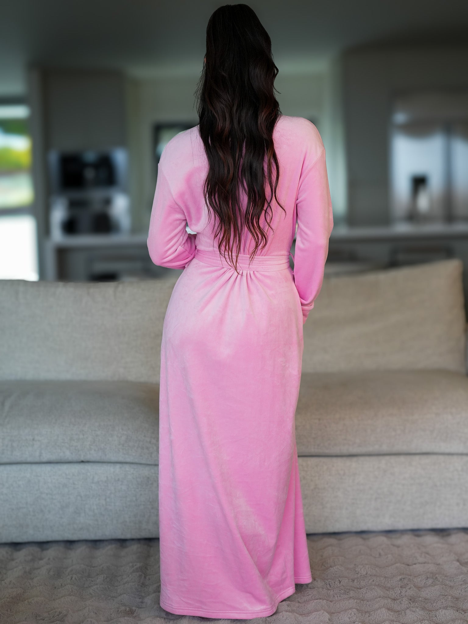 The Pink Princess Robe, a luxurious and enchanting addition to your long robe collection. This robe is a dream come true, measuring a graceful 54 inches in length and boasting the perfect bubble gum shade of pink.